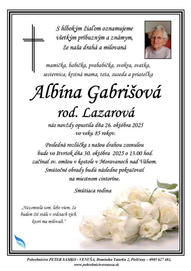 30.10.2025 o 13:00 začína svätou omšou v kostole v Moravanoch nad Váhom, smútočný obrad následne pokračuje na miestnom cintoríne
