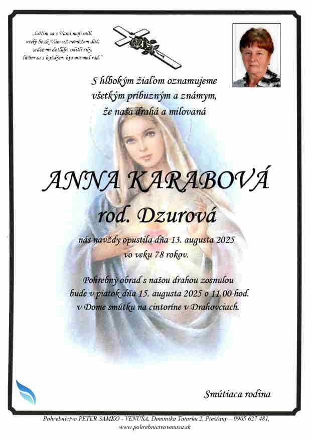 15.8.2025 o 11:00 v Dome smútku na cintoríne v Drahovciach