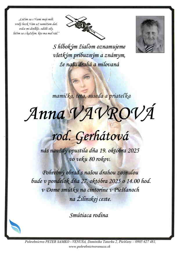 27.10.2025 o 14:00 v Dome smútku na cintoríne v Piešťanoch na Žilinskej ceste