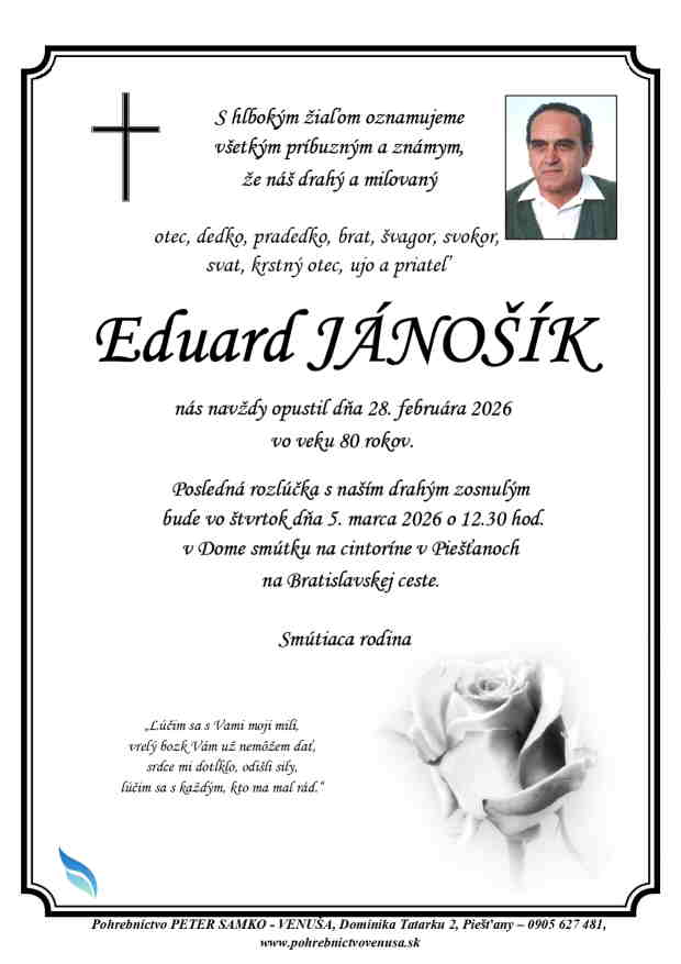 5.3.2026 o 12:30 v Dome smútku na cintoríne v Piešťanoch na Bratislavskej ceste