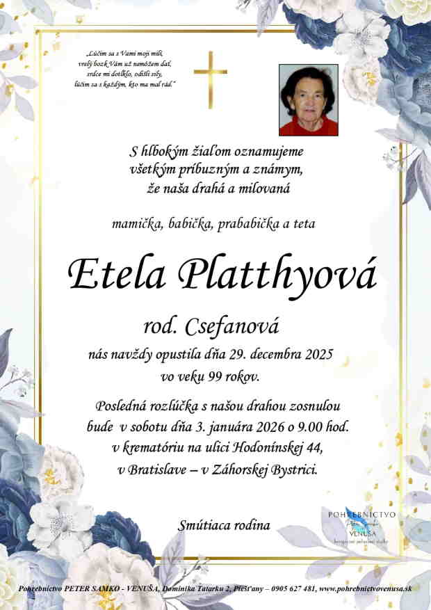 3.1.2026 o 9:00 v krematóriu na ulici Hodonínskej 44 v Bratislave - v Záhorskej Bystrici