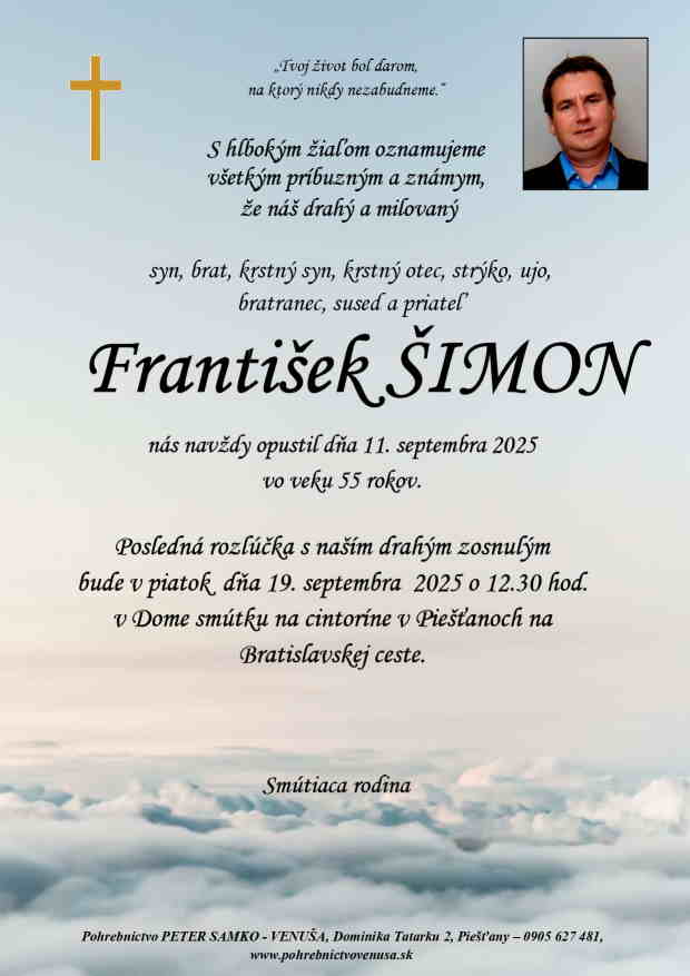 19.9.2025 o 12:30 v Dome smútku na cintoríne v Piešťanoch na Bratislavskej ceste