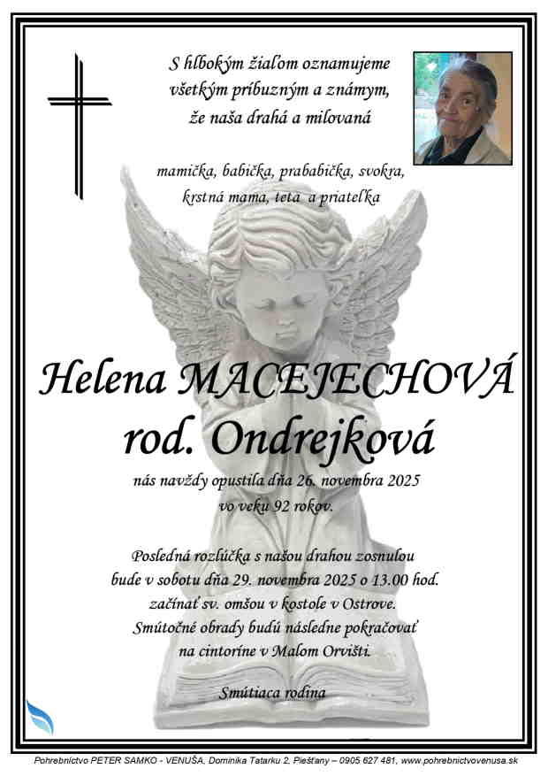 29.11.2025 o 13:00 začína svätou omšou v kostole v Ostrove, smútočný obrad následne pokračuje na cintoríne v Malom Orvišti