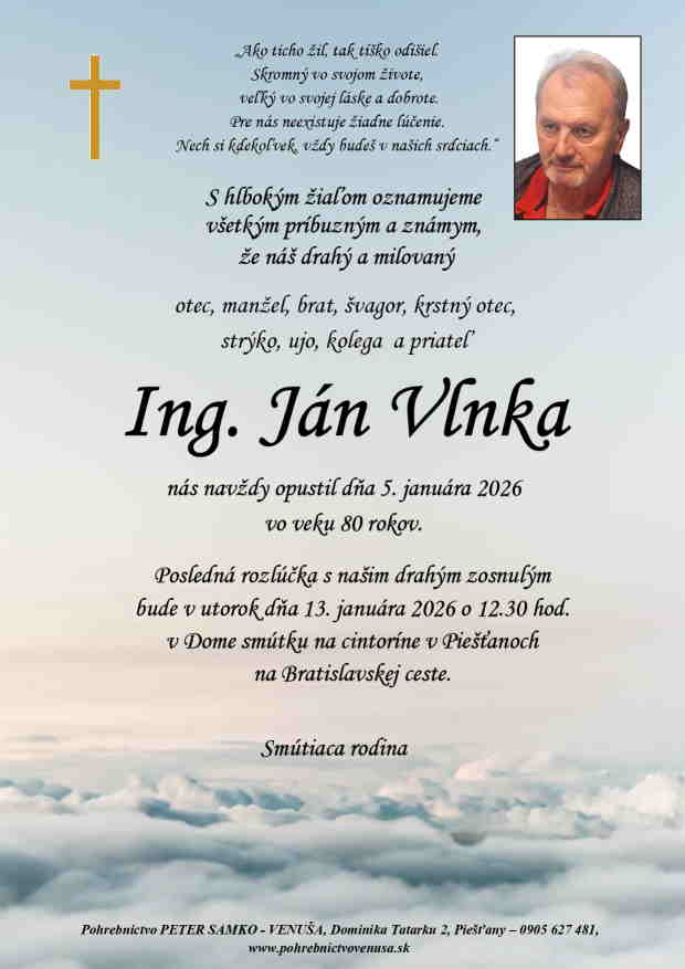 13.1.2026 o 12:30 v Dome smútku na cintoríne v Piešťanoch na Bratislavskej ceste