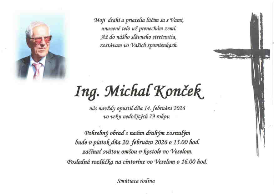 20.2.2026 o 15:00 začína svätou omšou v kostole vo Veselom. Posledná rozlúčka na cintoríne vo Veselom o 16:00.