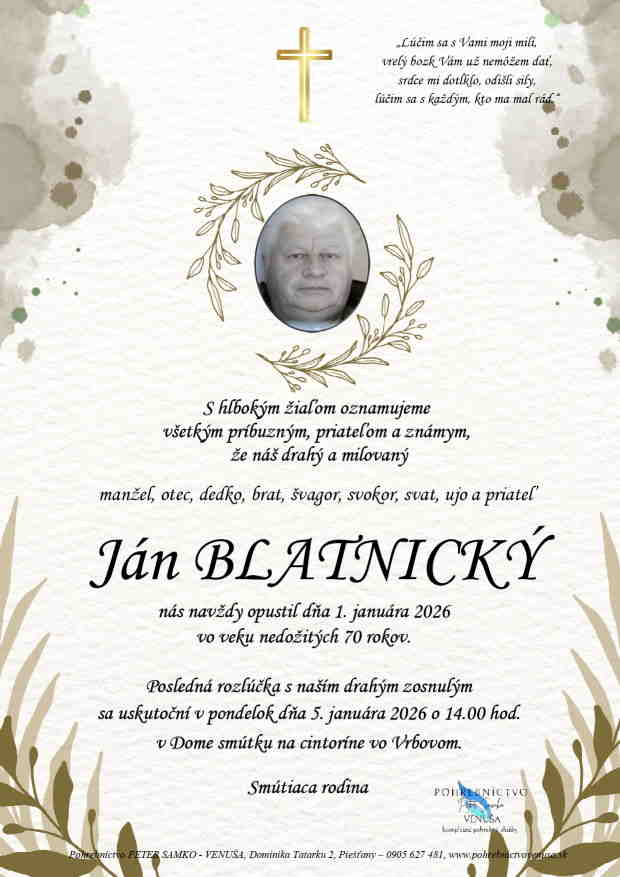 5.1.2026 o 14:00 v Dome smútku na cintoríne vo Vrbovom