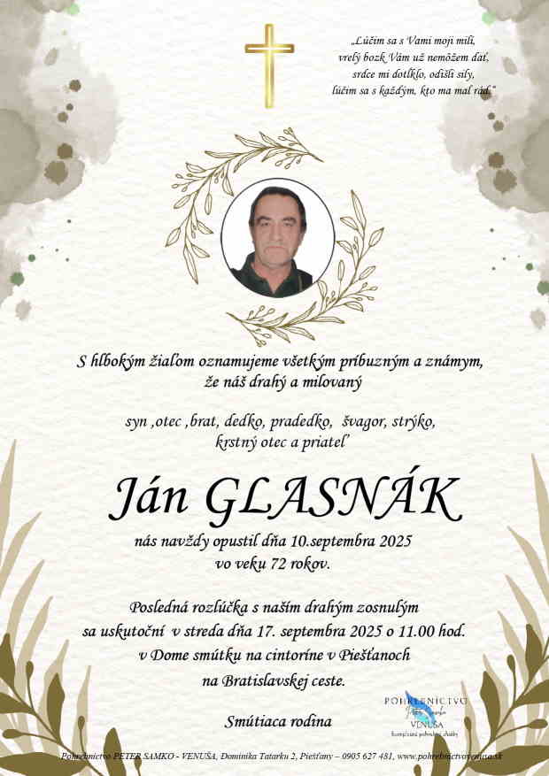 17.9.2025 o 11:00 v Dome smútku na cintoríne v Piešťanoch na Bratislavskej ceste