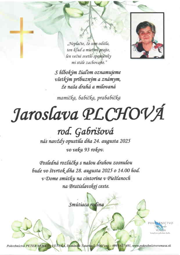 28.8.2025 o 14:00 v Dome smútku na cintoríne v Piešťanoch na Bratislavskej ceste