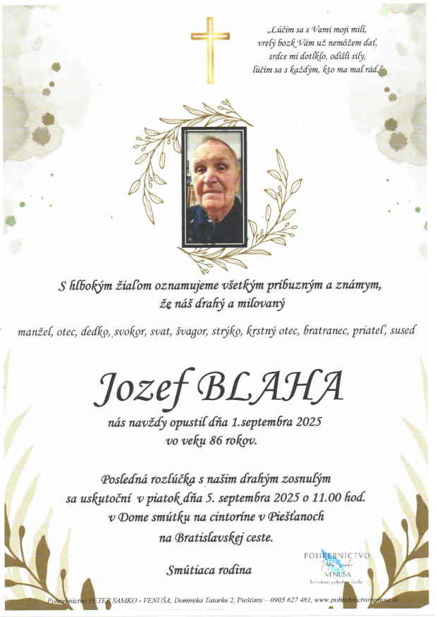 5.9.2025 o 11:00 v Dome smútku na cintoríne v Piešťanoch na Bratislavskej ceste