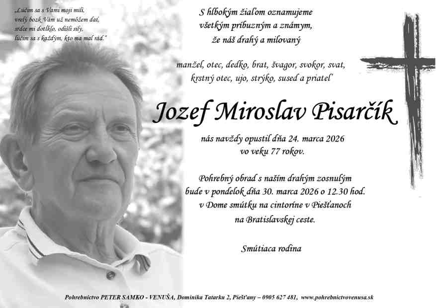 30.3.2026 o 12:30 v Dome smútku na cintoríne v Piešťanoch na Bratislavskej ceste