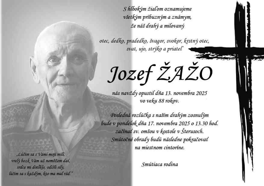 17.11.2025 o 13:30 začína svätou omšou v kostole v Šterusiach, smútočný obrad pokračuje na miestnom cintoríne