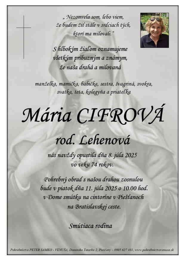 11.7.2025 o 10:00 v Dome smútku na cintoríne v Piešťanoch na Bratislavskej ceste