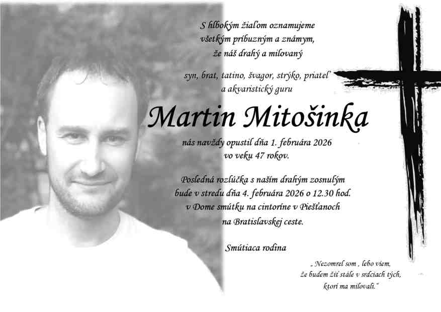 4.2.2026 o 12:30 v Dome smútku na cintoríne v Piešťanoch na Bratislavskej ceste