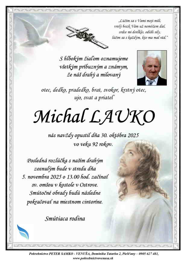 5.11.2025 o 13:00 začína svätou omšou v kostole v Ostrove, smútočný obrad pokračuje na miestnom cintoríne