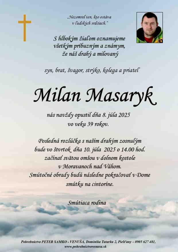 10.7.2025 o 14:00 začína svätou omšou v dolnom kostole v Moravanoch nad Váhom, smútočný obrad následne pokračuje v Dome smútku na cintoríne