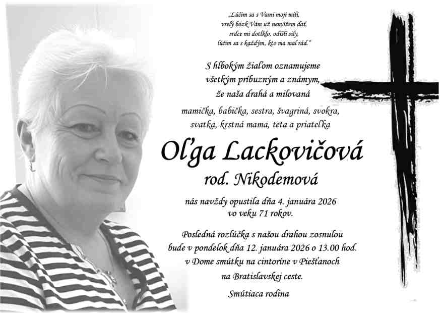12.1.2026 o 13:00 v Dome smútku na cintoríne v Piešťanoch na Bratislavskej ceste