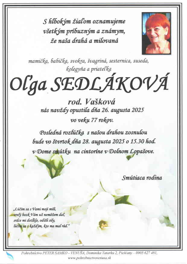 28.8.2025 o 15:30 v Dome smútku na cintoríne v Dolnom Lopašove