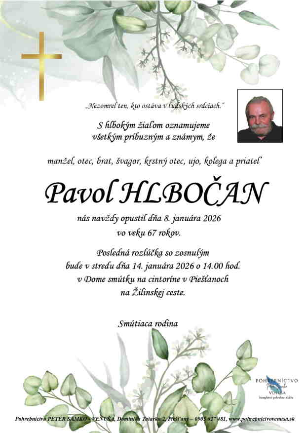 14.1.2026 o 14:00 v Dome smútku na cintoríne v Piešťanoch na Žilinskej ceste