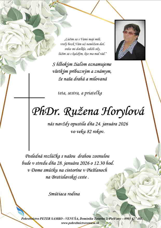 28.1.2026 o 12:30 v Dome smútku na cintoríne v Piešťanoch na Bratislavskej ceste