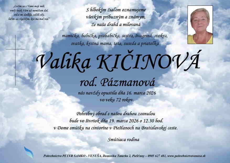 19.3.2026 o 12:30 v Dome smútku na cintoríne v Piešťanoch na Bratislavskej ceste